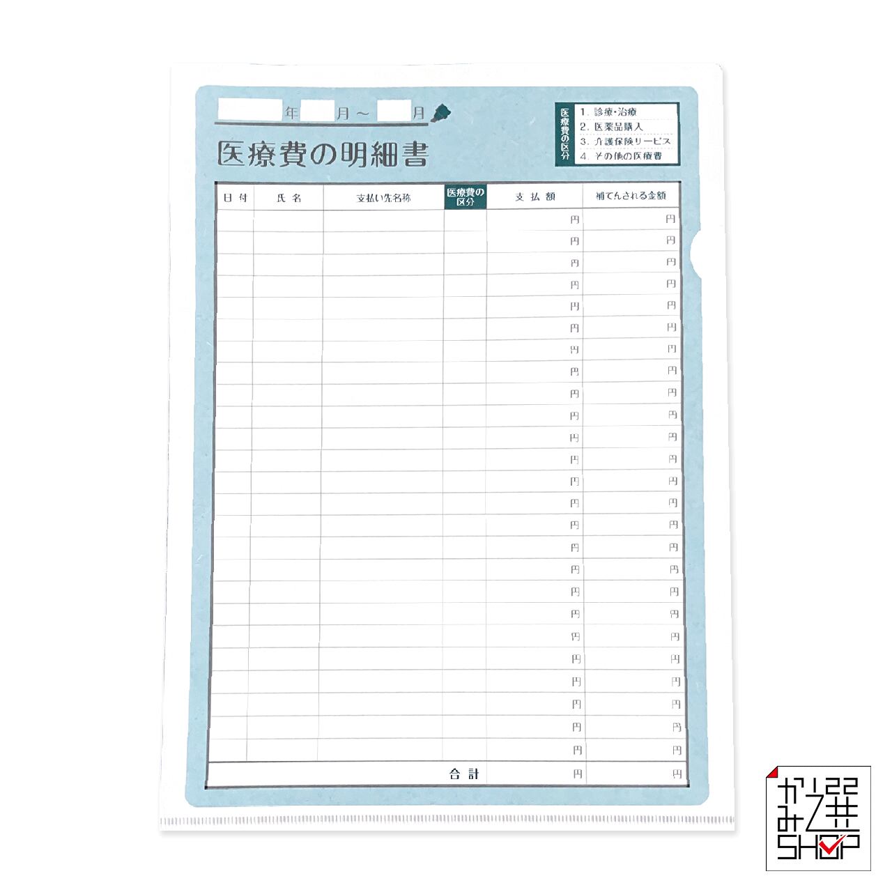 医療費控除の明細書に沿った項目付きの紙ファイルです。
